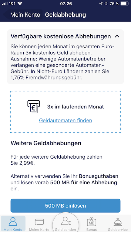 - Bargeld kann man an fast allen Automaten europaweit (drei Mal) kostenlos pro Monat abheben. Danach kostet es eine Gebühr, oder man setzt Bonuspunkte ein, die weitere kostenlose Abhebungen garantieren (verdientes Datenvolumen durch Umsätze einlösen). In zahlreichen Supermärkten, wie zB. REWE, Penny, DM, Rossmann, Budni, usw. kann man allerdings auch problemlos und unbegrenzt oft Geld abheben und (bis €100) einzahlen.