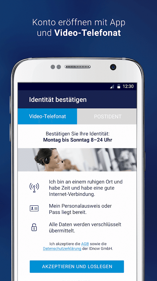 Danach lädt man sich die App herunter und loggt sich in sein Konto. Nun kann man mit seinem Personalausweis ein kurzes (ca. 5 Minuten) Videotelefonat führen, bei dem man seinen Ausweis in verschiedenen Winkeln vor die Handykamera halten muss. Alternativ funktioniert auch Postident, das dauert aber einige Tage.