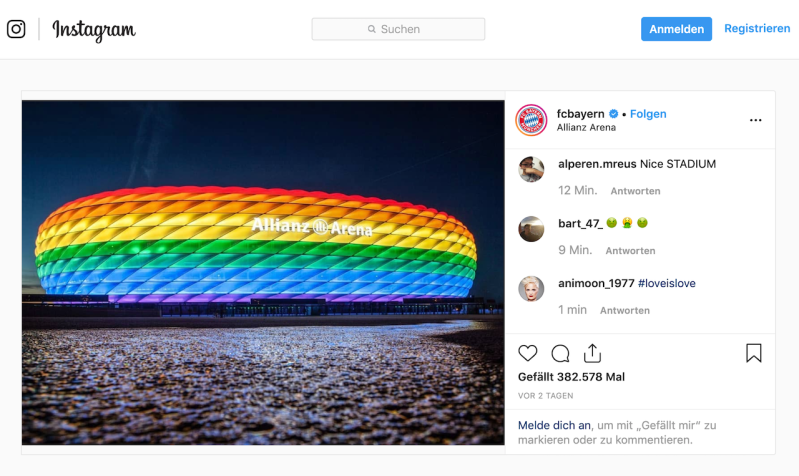 Es ist wohl doch nicht alles Friede, Freude, Eierkuchen auf Instagram? Eine Freundin zeigte mir gestern ein Posting vom FC Bayern München, der ein harmloses Bildchen seines Stadions in Regenbogenfarben ins Netzt gestellt hatte. Und schon ging der Shitstorm los! Grund genug, nochmals mit besonders bunten Farben einen Blogpost dazu zu machen…