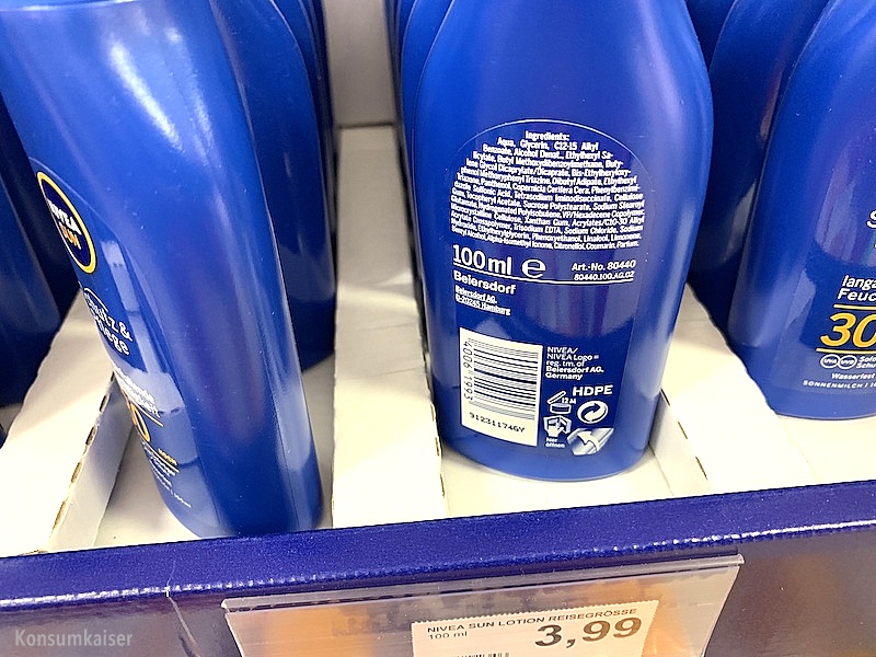 Ich verstehe, wenn man für den kleinen Wochenend-Trip nur kleine Packungsgrößen mitnehmen möchte. Eine große Familienflasche lohnt sich da nun wirklich nicht. Doch derzeit sind die meisten von uns deutlich länger unterwegs. Und wenn ich mir den extra großen Sonderständer mit den extra kleinen Nivea Sonnenmilchfläschchen so anschaue, habe ich die Befürchtung, dass sich da ausgerechnet die falschen Personen angesprochen fühlen!