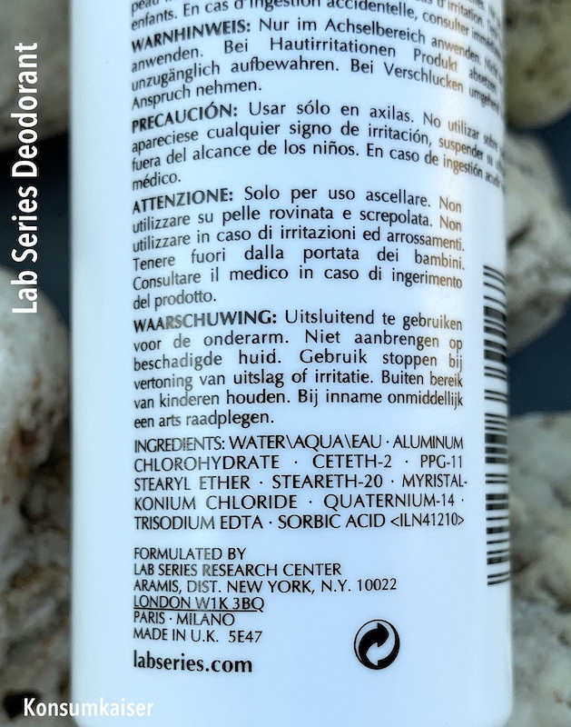Nun hatte ich letztens in einem Männer Pflege-Set u.a. einen Deoroller von Lab Series (Aramis/E.Lauder), der unparfümiert ist, einen guten Job macht, aber dafür im Einzelkauf auch ungefähr um die 20 Euro kostet. Die Inhaltsstoffe sind die üblichen Bekannten, ich kann nichts Schlechtes über die Wirkung sagen, ich fühlte mich den ganzen Tag über sicher und müffelte auch am Abend nicht – Alu sei Dank. Ja, ich nutze weiterhin Deos mit Aluminium.