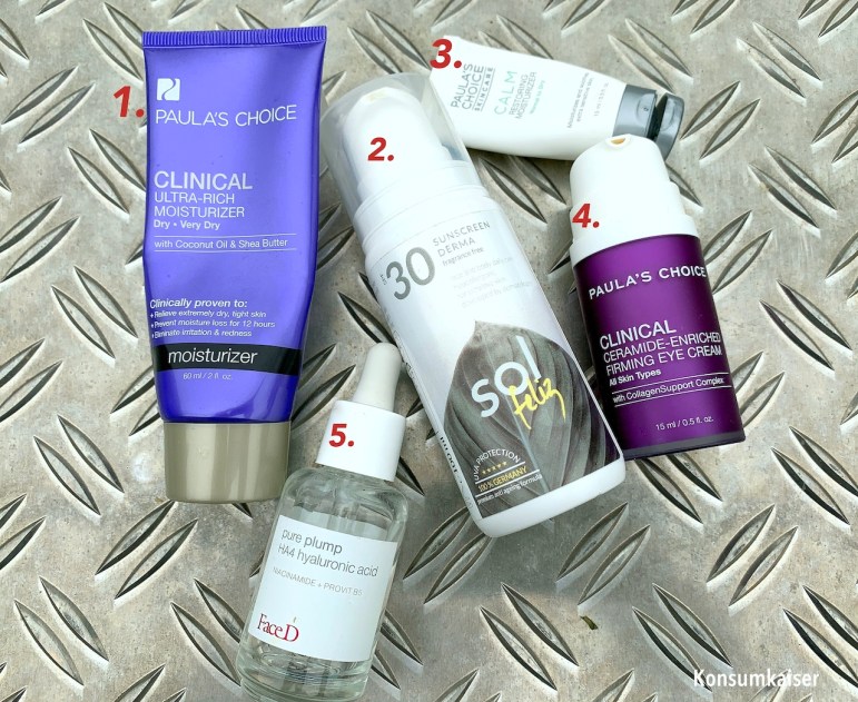Meine Nachkauf-Produkte bleiben CeraVe-Gesichtscremes mit und ohne SPF, sowie beide Reinigungen (Gel und Lotion), Korres Duschgel Basil Lemon, Vichy Pureté Thermal Reinigung 3 in 1, Paulas hellblauer SPF 50 und Sol Feliz 30, Niod NEC und Survival 0, Hylamide SubQ Advanced Serum, Stratia Liquid Gold, Paulas Clinical Retinol 1 %, Retinol BL, BHA BL und in der kälteren Jahreszeit der Clinical Moisturizer.