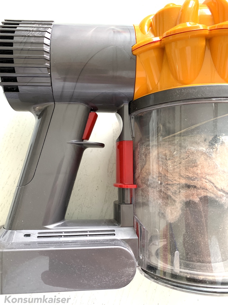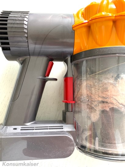 Das Gerät hat echt was drauf! Auch wenn ich von dem schwächeren Motor nicht allzu viel erwartet habe, macht der Dyson V6 mit seiner Zyklontechnik im Alltag richtig gut sauber. Kleine Krümel, die vom Frühstückstisch fallen sowieso, aber eben auch den Boden in der Küche, oder den Teppichboden im Schlafzimmer, selbst winklige Ecken erreicht die Saugkraft ziemlich gut. Als Bodenstaubsauger arbeitet die rotierende Elektrobürste effizient, und ich brauche so gut wie nie die Turbofunktion (Max) zu aktivieren, um auch die letzten Krümelchen aufzusaugen.
