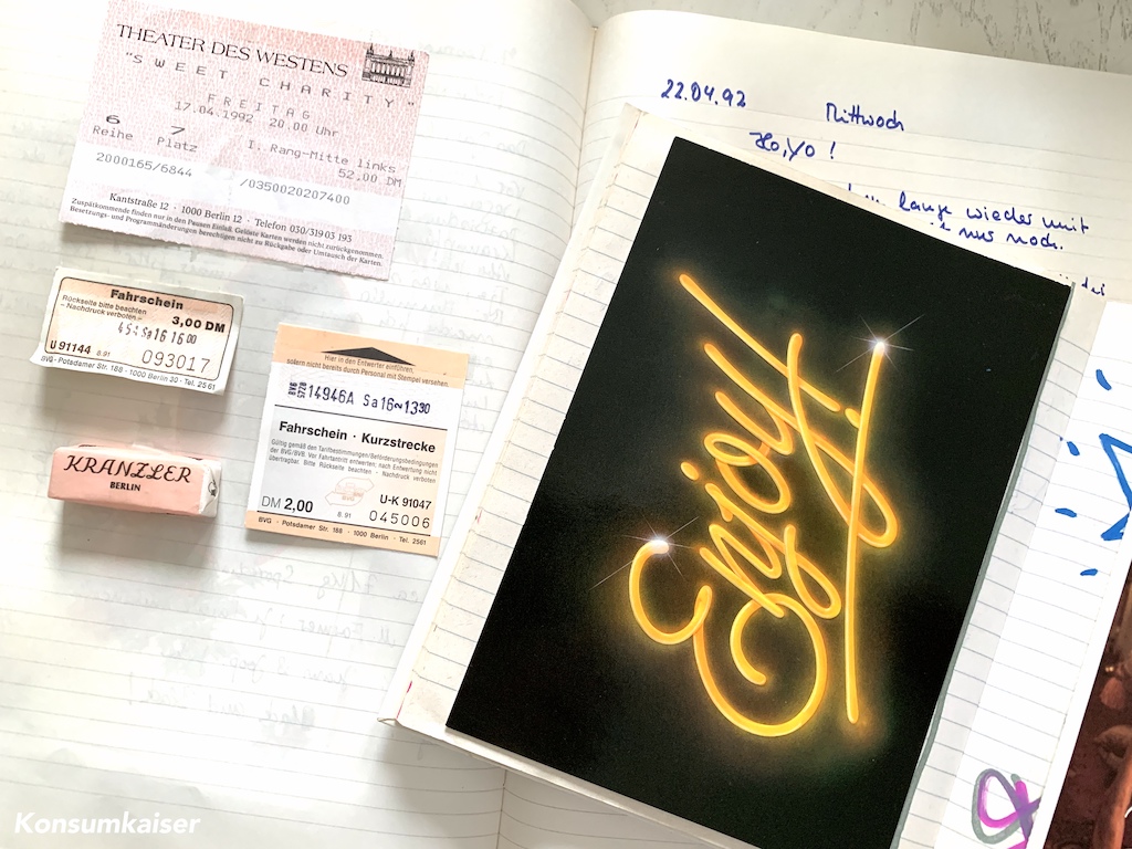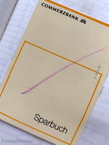 In meinen Tagebüchern und Blocks stosse ich auf eine wilde Sammlung der unterschiedlichsten Dine, irgendwie konnte ich Kleinkram früher nicht wegwerfen. Egal ob alte Rechnungen, Kassenzettel, Flugtickets oder Zuckerstücke aus dem legendären Café Kranzler, alles finde ich in meinen Büchern wieder. Sogar mein erstes (und einziges) Sparbuch war noch dabei. Ein Sparbuch! Weiß noch jemand, was das ist?