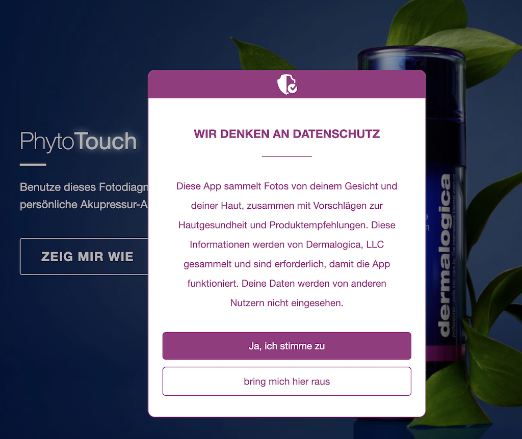 Warum ich aber eigentlich aufhorchte, war ein interaktives System, das Dermalogica per App dazu anbietet: Ein Fotodiagnosetool, mit dem man sein Gesicht fotografiert, und welches dann per KI persönliche Gesichtsmassagetipps…äh…Akupressur-Anleitungen anbietet. Dazu werden die Fotos verarbeitet, allerdings nicht auf dem Handy, sondern die werden zu einem Demalogica-Server geschickt.