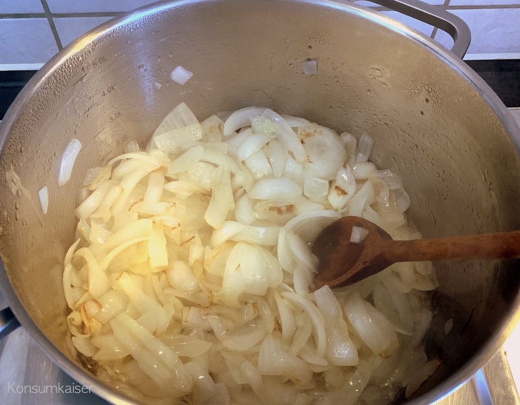 Zwiebeln hineingeben und unter ständigem Rühren andünsten. Sie müssen schön goldig werden, damit sie ein wenig karamellisieren und die Maillard Reaktion einsetzt, die für die herrlichen Röstaromen sorgt. (Ähnliches gilt später auch für den Paprika)