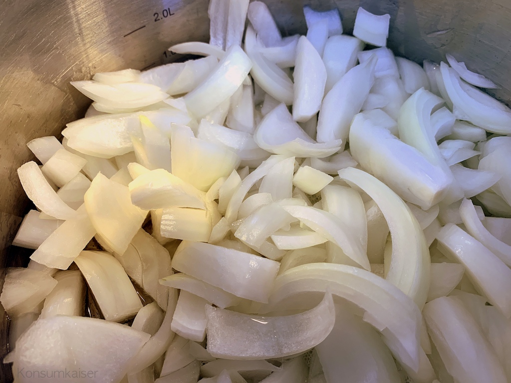 Zwiebeln schneiden, mittelgroße Stücke, Form egal, es verkocht eh.