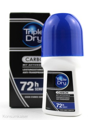 Das Triple Dry Deo Carbon, oder besser Anti-Transpirant, kommt zwar leider nicht in einer schön schwarzen Flasche daher, hat aber jetzt auch einen dezenten und markanten Duft zu bieten. Ich bin ja sehr für die unbeduftete Version, aber wer einen ganz dezenten Hauch von herber Parfümierung mag, sollte hier mal schauen. Weiterhin ordentlich leistungsstark ist das Produkt, wer auf Aluminium in Deos verzichtet, muss hier verzichten, hier ist ne Menge drin. Allerdings ist es auch eins der wenigen Deos, die im Zweifelsfall mal nicht versagen. Auf dieses Zeug verlasse ich mich total.