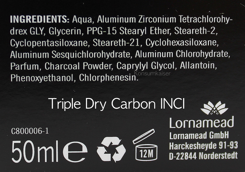 Das Triple Dry Deo Carbon, oder besser Anti-Transpirant, kommt zwar leider nicht in einer schön schwarzen Flasche daher, hat aber jetzt auch einen dezenten und markanten Duft zu bieten. Ich bin ja sehr für die unbeduftete Version, aber wer einen ganz dezenten Hauch von herber Parfümierung mag, sollte hier mal schauen. Weiterhin ordentlich leistungsstark ist das Produkt, wer auf Aluminium in Deos verzichtet, muss hier verzichten, hier ist ne Menge drin. Allerdings ist es auch eins der wenigen Deos, die im Zweifelsfall mal nicht versagen. Auf dieses Zeug verlasse ich mich total.