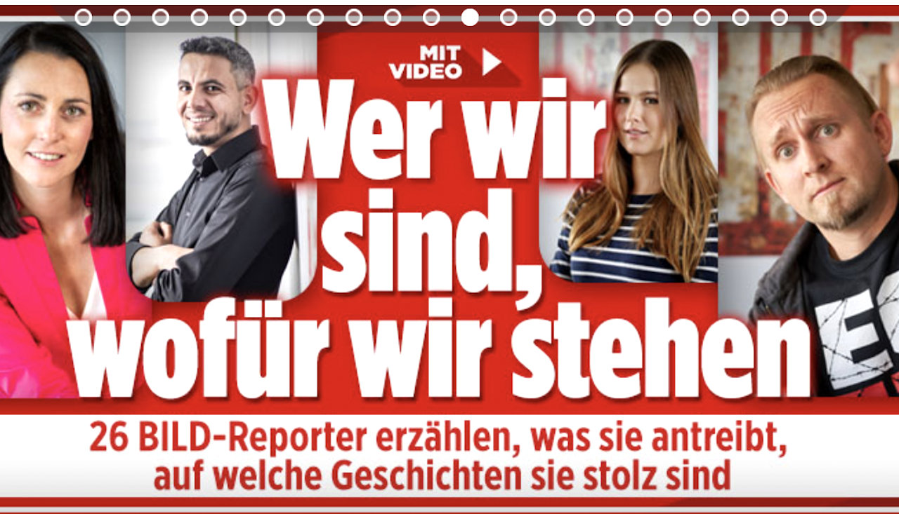 Eine Gruppe von Bild-Redakteuren hatte sich letztens aufgemacht, für ein bisschen Anerkennung zu betteln. Natürlich per Eigenmedium, ist ja so praktisch und bequem. „Wer wir sind, wofür wir stehen“ war die Überschrift, und beim Blick in die Gesichter einiger Bild-Mitarbeiter fragte ich mich schon irgendwie, ob die da wohl freiwillig so mehr oder minder freundlich in die Kamera geschaut haben?