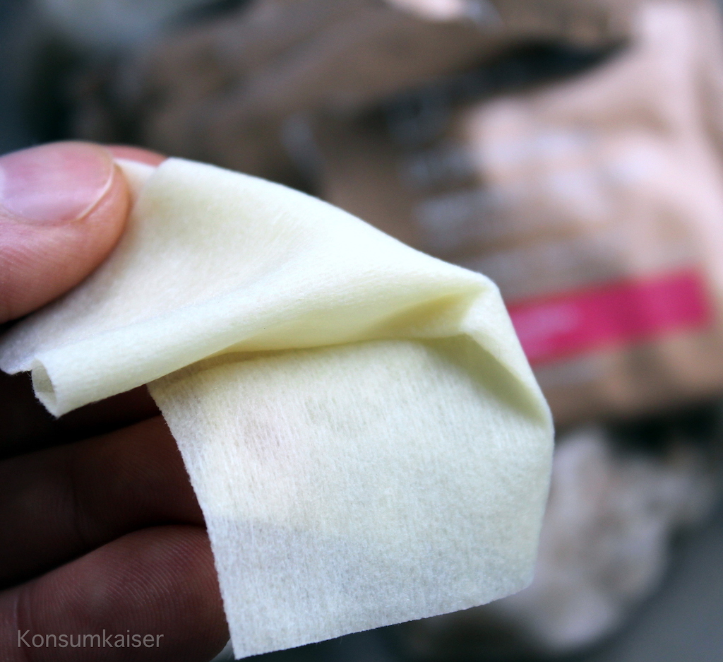Die Bezeichnung „Pads“ finde ich persönlich etwas hoch gegriffen, denn es handelt sich eher um sehr kleine dünne Tücher (bekannt von den „Erfrischungstüchlein“), die mit recht viel transparenter Bräunungstinktur getränkt sind, und die nur für das Gesicht und Dekolletee reichen, nicht für den Körper, wie man es von den einfachen SB-Tüchern aus dem Drogeriemarkt kennt.