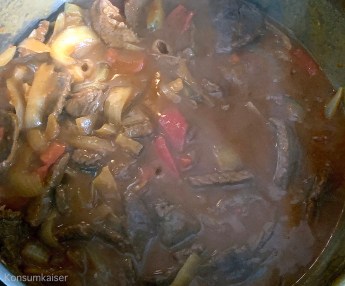 Nach ca. 30 Minuten gebe ich die restliche Brühe auf das Gargut (bis alles leicht mit Wasser bedeckt ist), schließe den Deckel und lasse nun alles mindestens eine Stunde köcheln. Auch hier wird immer mal wieder umgerührt.