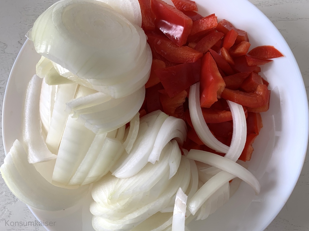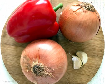 Zwei dicke Zwiebeln (ich nehme Gemüsezwiebeln), eine rote Paprika, zwei mittlere Knoblauchzehen.