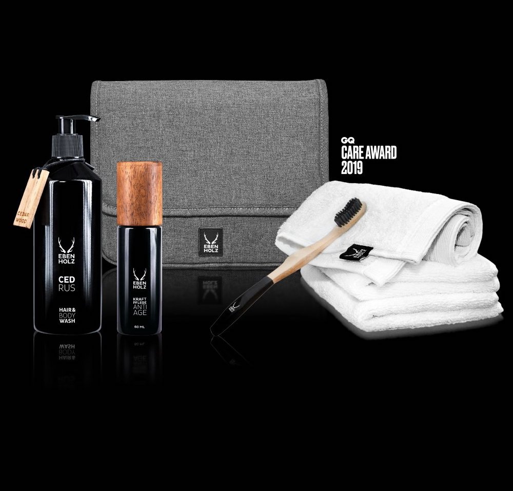 Das sehr schicke Flagship-Set besteht aus folgenden Komponenten: Die hochwertige und stilsichere Kulturtasche wurde in Deutschland entwickelt und besteht aus dem innovativen Werkstoff rPET – gefertigt aus 100% recycelten PET Flaschen. Ein Ebenholz Tuch aus flauschiger Baumwolle passt perfekt zur eigens entwickelten Ebenholz Holzzahnbürste. Abgerundet wird das Luxusset durch die Pflegehighlights CEDRUS Hair & Bodywash 330ml (darüber hatte ich HIER berichtet), Kraftpflege Anti Age 60 ml und Straffendes Augenserum 30ml (üppig!). Die Pflegeprodukte werden stilvoll nachhaltig verpackt in Glas, Holz und Metall.