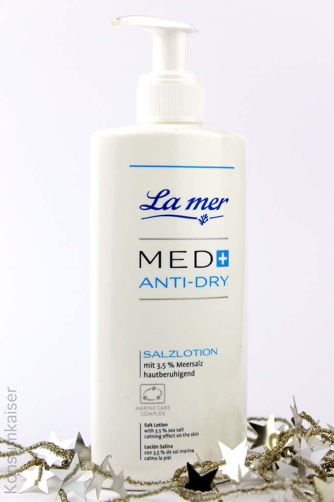 La Mer (Deutschland) Med Anti-Dry Salzlotion (200 ml ca. € 35,00) Meine Allroundcreme, die immer neben dem Waschtisch steht. Nach dem Händewaschen, oder wenn das Gesicht einfach etwas spannt: Ein Pumphub von der reichhaltigen Lotion, und die Haut ist ruhig. Dabei fettet es schon en wenig, Lipide sind enthalten, aber das entspannt so schön die Haut. Also nix für sehr ölige Hauttypen. Aber genau richtig, wenn die Haut mal zwischendurch etwas Hilfe braucht, oder nur einen zickigen Tag hat. Der Spender ist echt praktisch, sodass man öfter schnell mal pflegt.