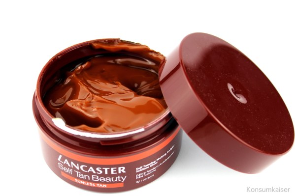 Schön finde ich auch die Farbe, die bei mir genau richtig wird, nicht zu dunkel, nicht zu schwachbrüstig. Dazu ist die Konsistenz traumhaft, weil sie elegant auf die Haut gleitet, der Lancaster-Duft (plus Kokoswasser) ist ziemlich stark, aber damit übertüncht man auch den Selbstbräunerduft.