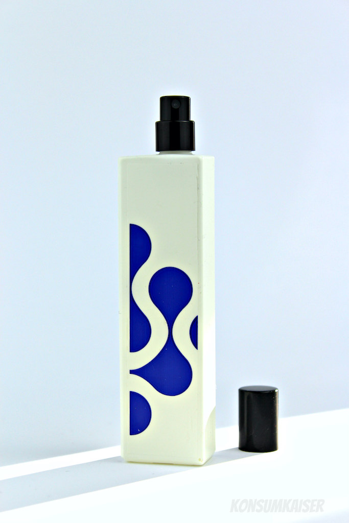 Der Gedanke einer Duftbibliothek kommt einem sofort, wenn man die Packung des Duftes sieht: Ähnlich wie ein Buch klappt man die Verpackung auf, in der sich der schlichte Flacon verbirgt. Weiß und Blau, mit einer schwarzen Kappe auf dem Sprühknopf. Der Flacon ist ein kleiner Handschmeichler, ist aus schwerem Glas und ähnelt feinen Fliesen.