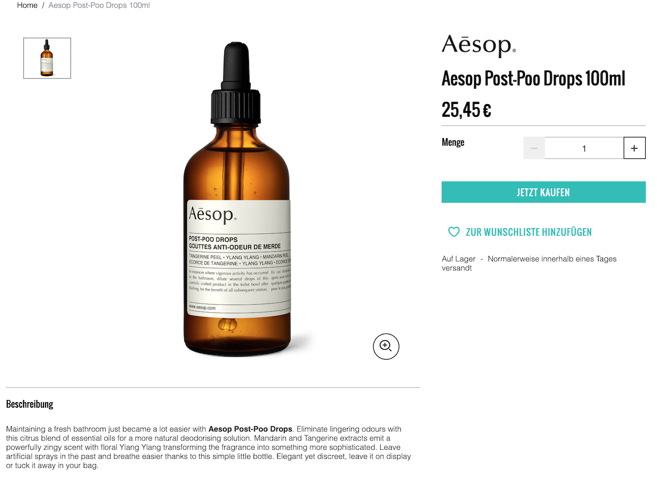 Kosmetikhersteller Aesop hat da eine handfestere Bezeichnung gewählt, die auf Englisch völlig einleuchtend klingt: „Post-Poo Drops“. Auf Französisch klingt es aber gleich, als ob klitzekleine Mondschein-Elfen eine hauchzarte Baisertorte gebacken hätten: „Gouttes Anti-Odeur De Merde“ Hach…Bleibt nur noch die Frage, warum es ausgerechnet Tropfen sein mussten…