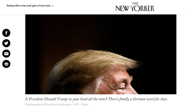 Die Journalistin Susan B. Glasser beschreibt in ihrem Artikel im New Yorker das mehr als verstörende Gebaren des seltsamen Präsidenten mit gefährlicher cerebraler Diarrhoe, und erwähnt in diesem Zusammenhang die gekürzte Wortschöpfung der deutschen Autorin Constanze Stelzenmüller: Trumpschmerz. Deutsche Worte sind in den USA ja immer noch ziemlich angesagt, und was liegt näher, als Trump mit einer martialisch klingenden Sprache in Verbindung zu bringen?