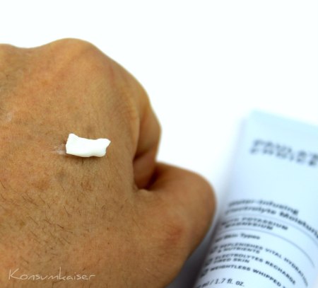 Die Konsistenz ist ganz witzig, denn aus der Tube kommt eine ziemlich kompakte „Creme-Wurst“, die aber beim Verreiben geradezu gelig bis flüssig auf der Haut wird: