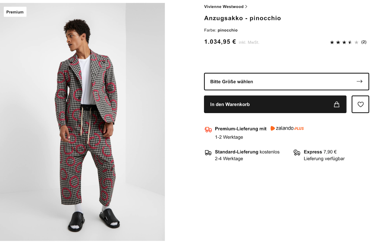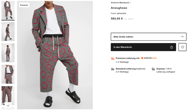 Doch was ich letztens aus dem Atelier Westwood gesehen habe, lässt mich aber eher zweifeln, ob die nun Karnevalsbedarf herstellen. Ich präsentiere: Die Anzughosen-Sakko-Kombination „Pinocchio“ – für insgesamt schlappe 1600 Euro. Immerhin bei Modeschleuder Zalando erhältlich.