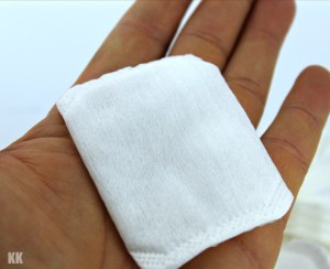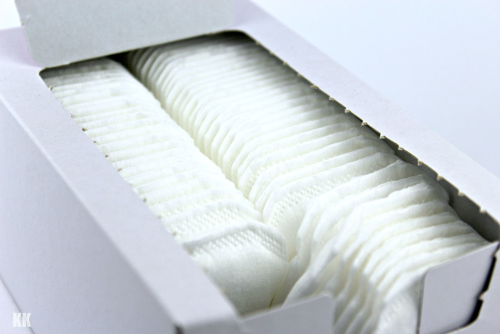 Eigentlich wirken die Pads wie Teebeutel aus Baumwolle, sind aber von der Oberfläche tatsächlich seidenweich. Im Inneren sind sie manchmal leicht mit Baumwollfasern gefüllt, dieser Kisseneffekt saugt die Flüssigkeit gut auf, und gibt sie unter leichtem Druck auch sofort wieder ordentlich ab.
