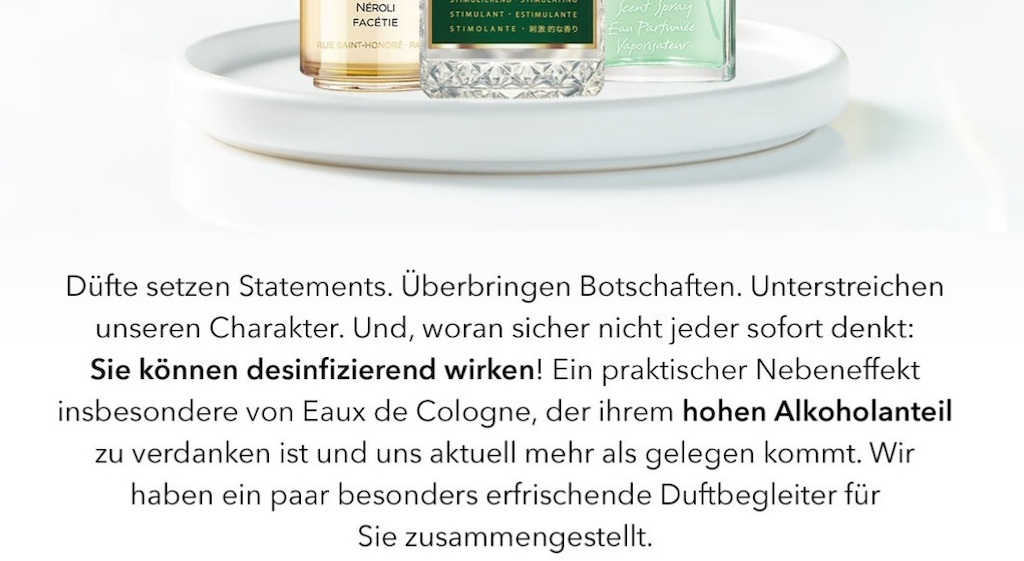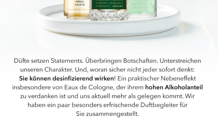 Besonders die Eaux de Cologne, die uns mit ihrem hohem Alkoholanteil „aktuell mehr als gelegen kommen“