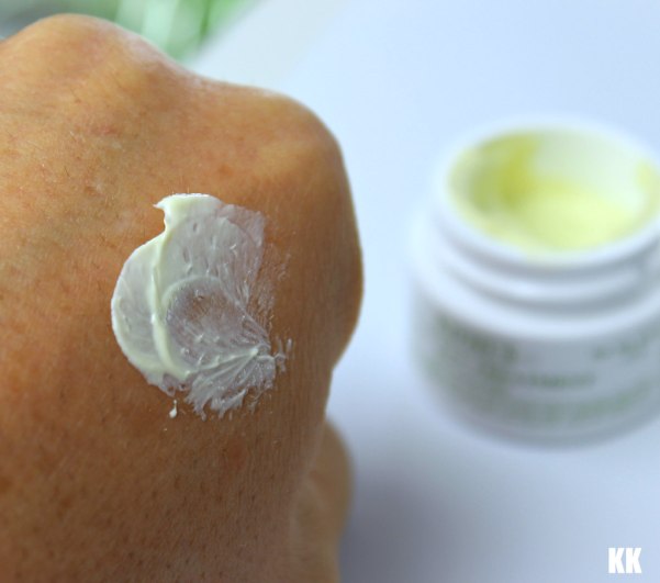 Dicklich und fettig wirkend schmiegt sich die Creme an meinen Finger und wartet geradezu unter dem Auge zur Geltung zu kommen. Lustigerweise wird die buttrige Creme beim Kontakt mit der Haut sofort weicher und weicher. Beim vorsichtigen Verteilen verwandelt sie sich geradezu in eine Lotion und lässt sich angenehm und gut verteilen. Mutig gebe ich auch einen Klecks auf das Oberlid, ich soll es nicht bereuen, denn die Creme ist bei mir mega verträglich.