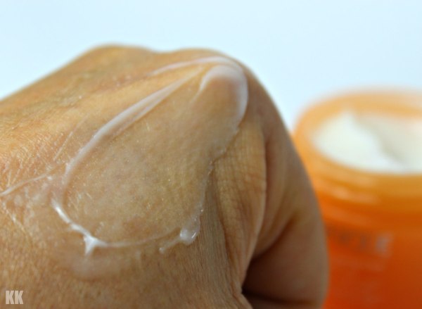 Die Creme ist auch recht schön aufzutragen, wenn auch ein bisschen schwieriger, aber sie bietet eine deutlich cremigere Konsistenz, die die Haut sanft streichelt. Die Frische des Gels findet man hier nicht, dagegen ist die Creme deutlich kompakter und gibt ein Gefühl der „Festigkeit“ auf der Haut.