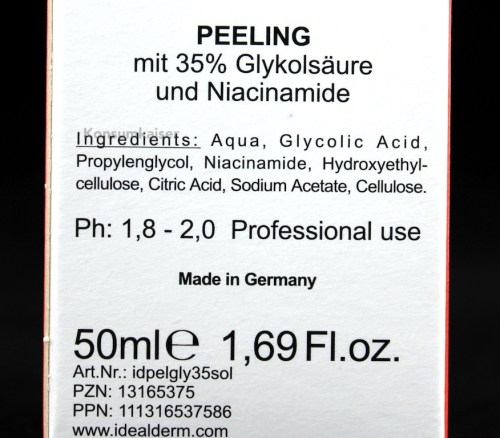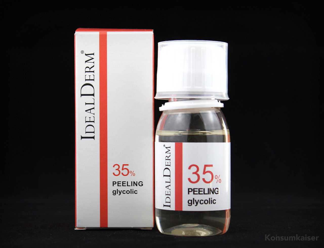 Ich stöbere ja gerne mal zwischendurch im Internetshop von Idealderm, denn dort gibt es ständig spannende Produkte zu entdecken. Einziges Problem: Ich finde es dort extrem unübersichtlich und irgendwie nicht einladend. Trotzdem bin ich in meiner Lieblingsrubrik „Peeling“ fündig geworden. Ein Glykolsäurepeeling mit 35% und einem pH Wert von angeblich 1,8 – 2 weckte mein Interesse.