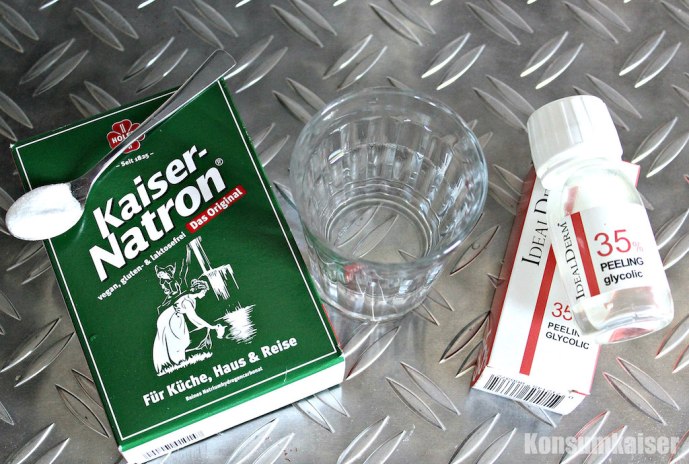 Legt euch alles erst einmal bereit. Besorge ein Glas Wasser, darin kann man ein bis zwei Teelöffel Natronpulver (ich habe hier Kaiser Natron aus dem Supermarkt) auflösen. Damit wird das Peeling neutralisiert. Das ist wichtig, es darf nicht länger auf der Haut bleiben!