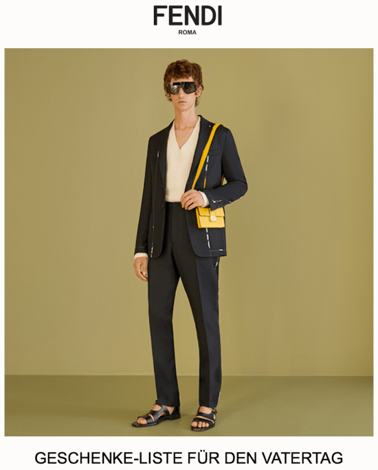Trudelt letztens eine Werbe-Mail vom Luxuslabel Fendi bei mir ein. Es geht um Vatertagsgeschenke. (Ja, ich weiß, jetzt haben wir erst einmal Muttertag) Warum nicht dem lieben Papa ein komplettes Fendi Outfit schenken? Das empfiehlt jedenfalls Fendi selbst. Hui, denke ich mir noch, ein paar Tausender für nen Anzug, ein paar Schlappen und ne olle eingelaufene Damenhandtasche. Ist ja allgemein üblich, sowas zum Vatertag zu verschenken…ähem.