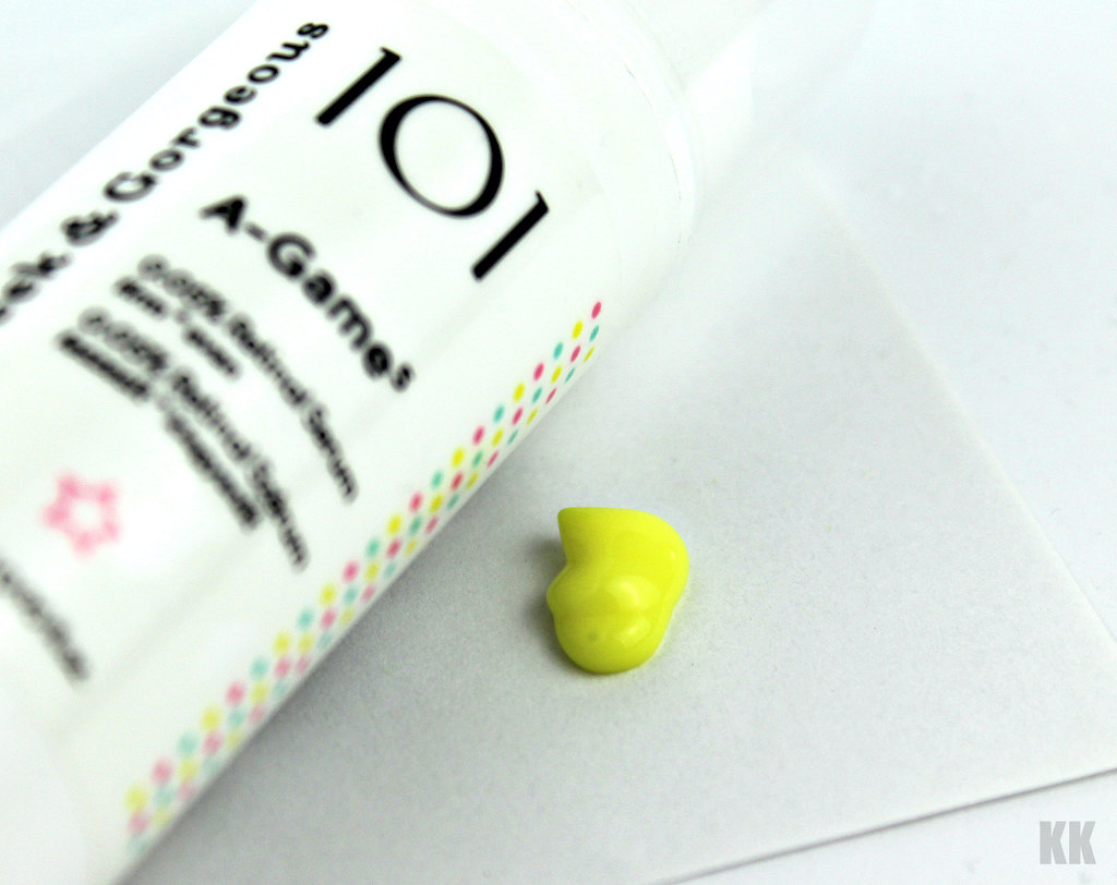 Die Konsistenz von A-game 5 ist ein Mittelding zwischen Absorica (fester) und RETINAID (etwas flüssiger), es lässt sich aber mustergültig verteilen und zieht schnell und weitestgehend rückstandslos in die Haut ein. Verwendet man ein bisschen zu viel, wird man eventuell gelbe Spuren an weißer Bekleidung und Kopfkissen finden können. Die typische Färbung kommt vom Retinal und ist kein künstlicher Farbstoff.