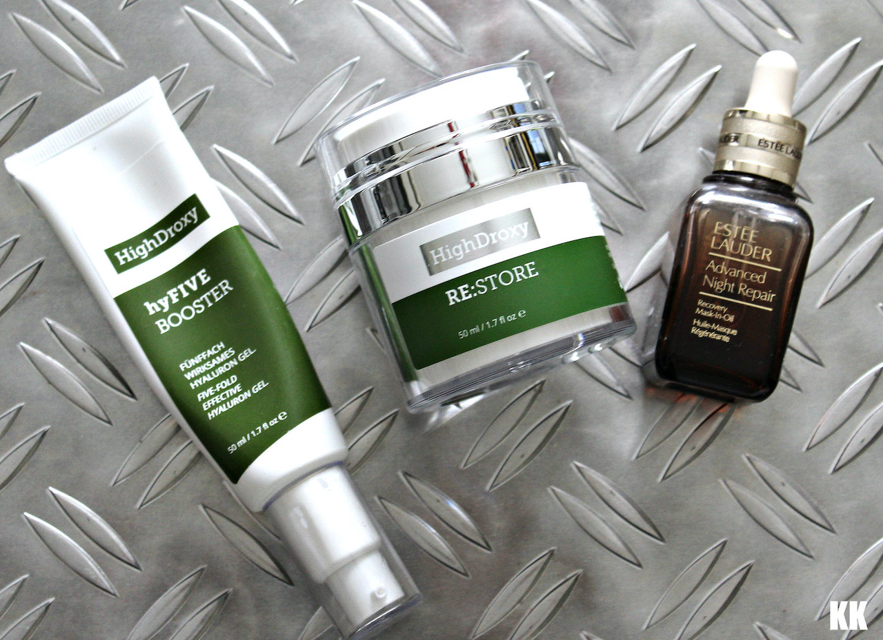 Am Abend nutze ich zuerst Retinol/Retinal (derzeit RETINAID forte) von HighDroxy und warte ein paar Minuten (muss nicht, ich tue es aber), danach mische ich einen Pumphub hyFIVE Hyalurongel (ebenfalls HighDroxy) mit einem 3/4 Pumphub RE:STORE (HighDroxy), und dazu zwei Tropfen vom Estée Lauder Advanced Night Repair Recovery Mask In Oil. Demnächst will ich das Lauder Öl gegen das Gesichtsöl von HighDroxy tauschen (Calm Face Oil), da ist die Ölmischung noch einmal eleganter. Ich warte allerdings noch auf die nächste Rabattaktion bei HighDroxy, die schon vor der Tür steht!
