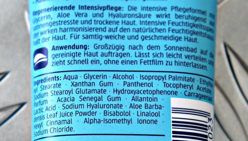 Eigentlich wundert man sich, denn es sind auch viele nette und nutzvolle Inhaltsstoffe dabei, die der Haut sicherlich nach einem Sonnenbad gut tun können. Aber der viele ungute Alkohol, sowie die relativ zahlreichen Duftstoffe (inklusive einige der extra deklarationspflichtigen), machen alles wieder zunichte – jedenfalls bei entsprechend veranlagter Haut. Bei mir kenne ich das nur zu gut. Manchmal vertrage ich diese potenziellen Stressoren supergut, und manchmal killen sie mich mit Fettglanz, Austrocknung, einem Rosazea-Ausbruch oder Rötungen.