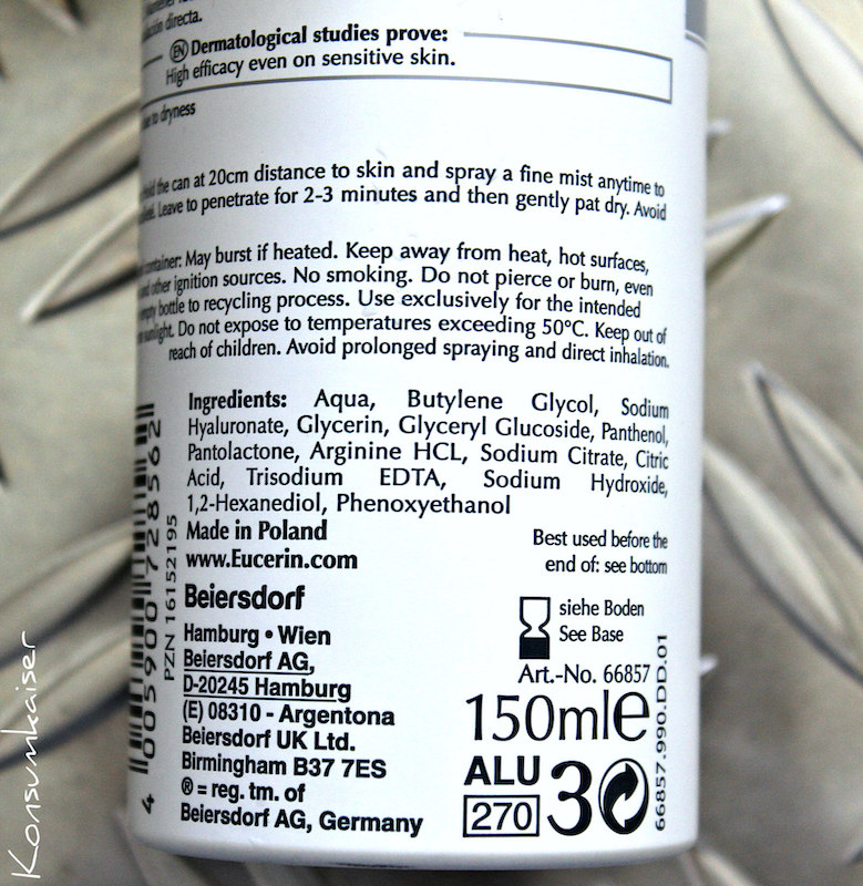 Und da Eucerin bei der Preisgestaltung relativ moderat vorgegangen ist, habe ich mir das Produkt guten Gewissens gekauft. Aufgrund der schönen Sprühperformance (schickes Wort, he), und der guten zusätzlichen Feuchtigkeitsanreicherung, kann ich das Produkt durchaus empfehlen.