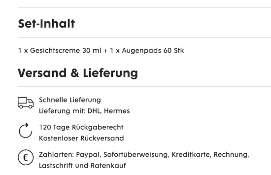 In der Packung fanden sich dann aber eine Creme mit 20 ml Inhalt und die Dose mit den Augenpads umfasste nur insgesamt 30 Pads.