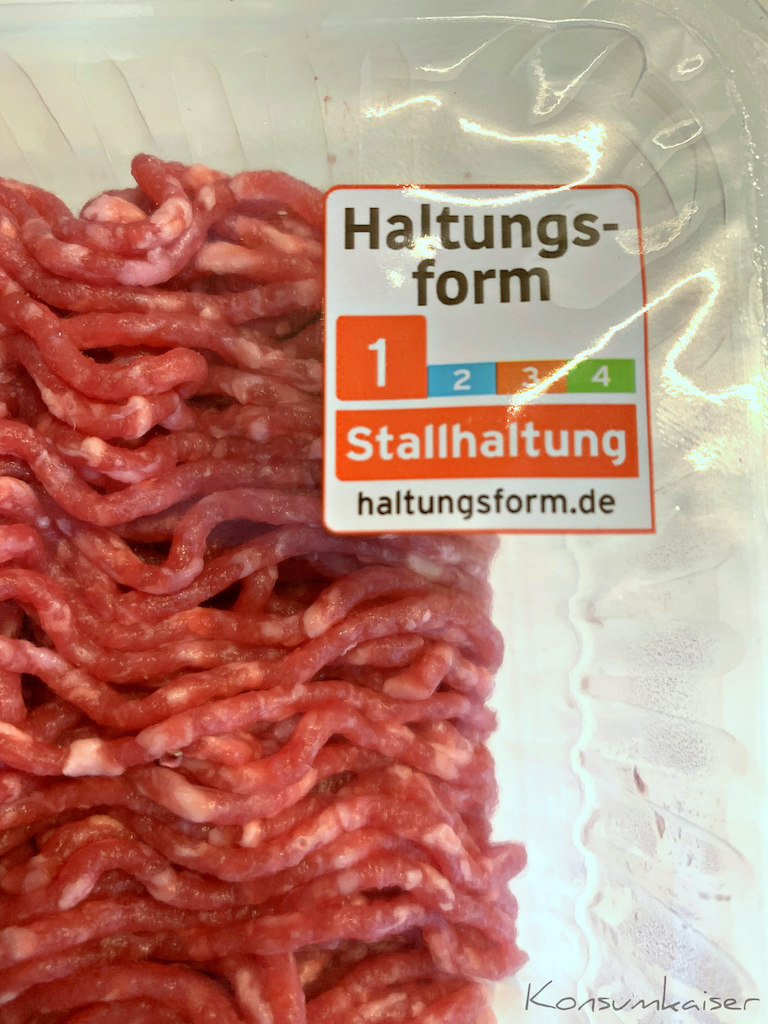 Eins der neuen Labels zeigt die Haltungsform an. Schlechteste Möglichkeit: „Stallhaltung“. Der unmotivierte Kunde von vorhin wird fragen: „Na und? Stall ist doch prima, schön warm und sicher, oder?“