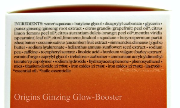 Und damit sind wir auch schon beim ersten grundlegenden Problem dieses Produkts angekommen, denn der Duft wird von einer ganzen Reihe extra deklarationspflichtiger Duftstoffe realisiert, man könnte auch sagen, Origins haben hier alles an Zitrusölen (plus Minzöl) reingeschüttet, was auffindbar war. Ein Blick auf die Inhaltsstoffliste bestätigt diesen Verdacht sozusagen.