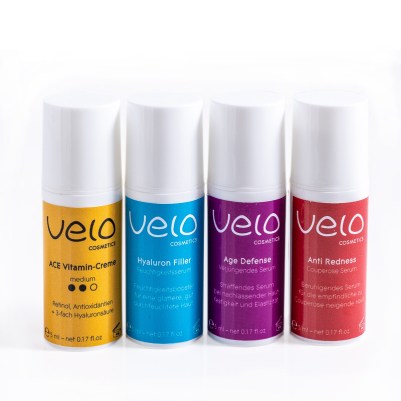 Das Set mit jeweils 4 Deluxeproben zu derzeit reduzierten € 24,96 beinhaltet immer den tollen Hyaluron-Filler, das multifunktionelle Age-Defense Serum, und das stark hautberuhigende Anti-Redness Serum. Dazu kommt dann nach Wahl die ACE Vitamin-Creme mit Retinol in der Variante „light“, „medium“ oder „rich“. Die praktischen und schützenden Mini-Pumpspender enthalten jeweils mindestens 5 ml vom Produkt.