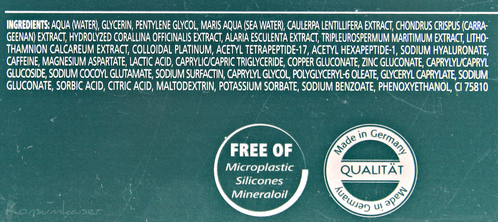 Wunderdinge sind nicht enthalten, aber gute Feuchtigkeitsspender, Antioxidantien, der ziemlich umfangreiche und interessante Algenextrakt-Komplex, sowie die Peptide (in einer ansprechenden Menge, nicht nur so eine Pseudo-Beigabe) bringen augenscheinlich einen Wert für die Haut. Jedenfalls für meine, und ich bin immer froh, wenn ich schnell und offensichtlich „Beweise“ für irgendeine Wirkung auf meiner Haut erkennen kann – das ist ja nicht üblich.