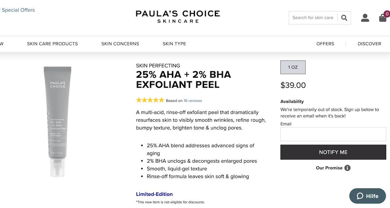 tja, dass das Paula-Produkt nicht nach Deutschland kommt war zu befürchten. Leider ist es wie gemacht für mich. Endlich ein Kombiprodukt (AHA + BHA) mit ausreichend hoher Dosierung und von Paula. Herz was willst Du mehr?!