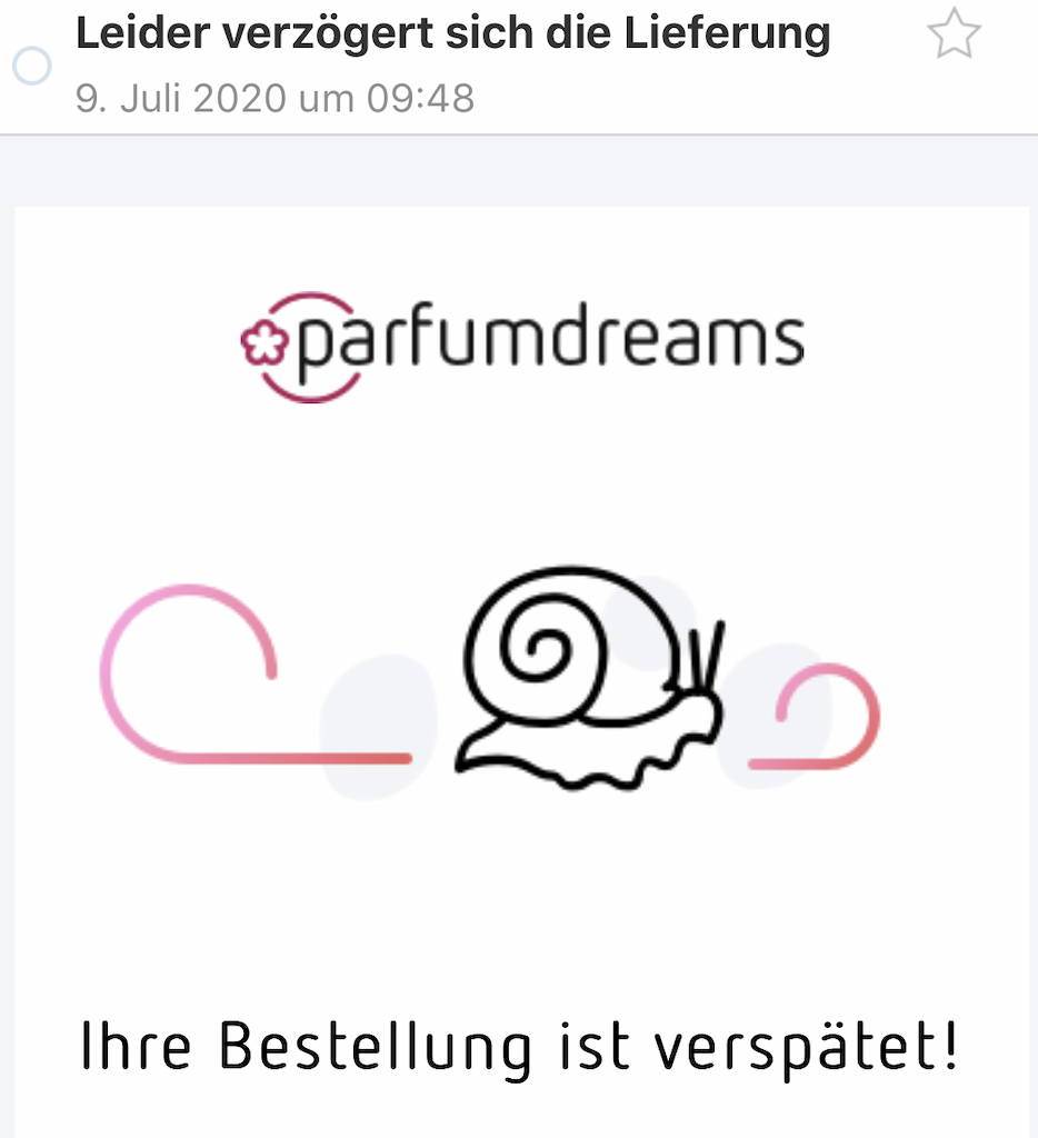 Seitdem die Parfümerie Parfumdreams nun zu Douglas gehört, scheint so gut wie nichts besser geworden zu sein. Nach mehreren Bestellungen, war stets irgendein Produkt nicht lieferbar. Die Meldung dazu kam erst viele Tage später, nachdem ich schon eine „Vermisstenanzeige“ aufgeben wollte. Die Schnecke oben sollte man als neues Firmenlogo etablieren.