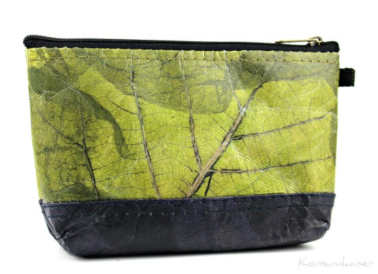 „Blattleder wird aus den abgefallenen Blättern von Teak- und Kautschukbäumen aus Süd- und Südostasien gefertigt und ist ein wenig steifer als Leder. Es werden keine Chemikalien verwendet, um es weicher zu machen. Jede Tasche ist ein Unikat mit eigener Blatt-Maserung und wird von Hand bearbeitet. Blattleder ist wasserabweisend (da mit Wachs versiegelt) und vegan. Von innen sind die Täschchen mit Baumwollstoff ausgekleidet. Blattleder ist eine pflanzliche Alternative zu Leder und nachhaltig. Da es sich hier um ein Naturprodukt handelt, variieren die Maserung und die Farbe von Produkt zu Produkt.“