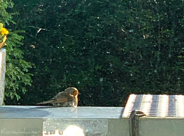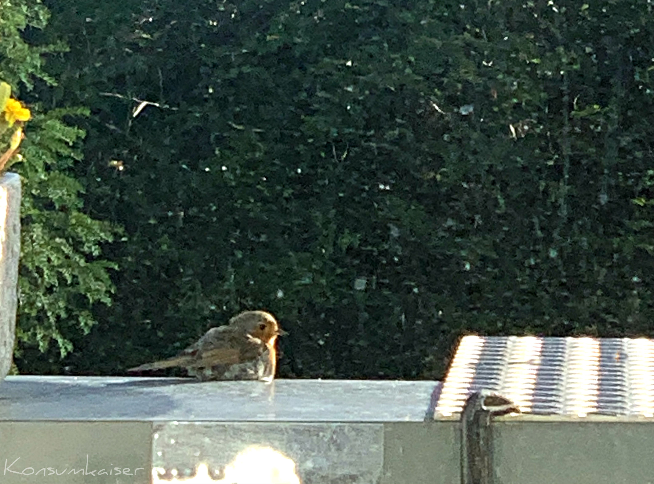 Letztens setzte sich sogar ein kleiner Vogel einfach so auf die Balkonumrandung und wärmte sich ein wenig den kleinen Vogelpopo. Es sah zumindest so aus. Er blieb eine ganze Zeit dort sitzen und beschaute die Welt, bis er irgendwann zum Futterhäuschen flog und mit einem stattlichen Körnchen davonflog.