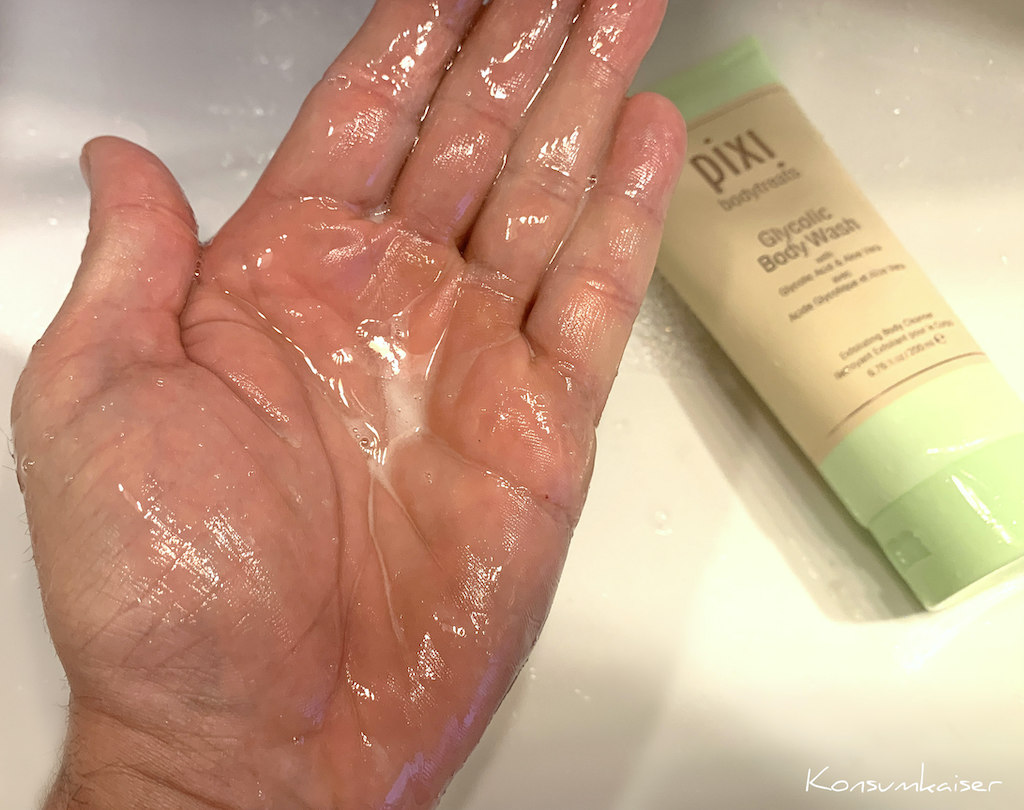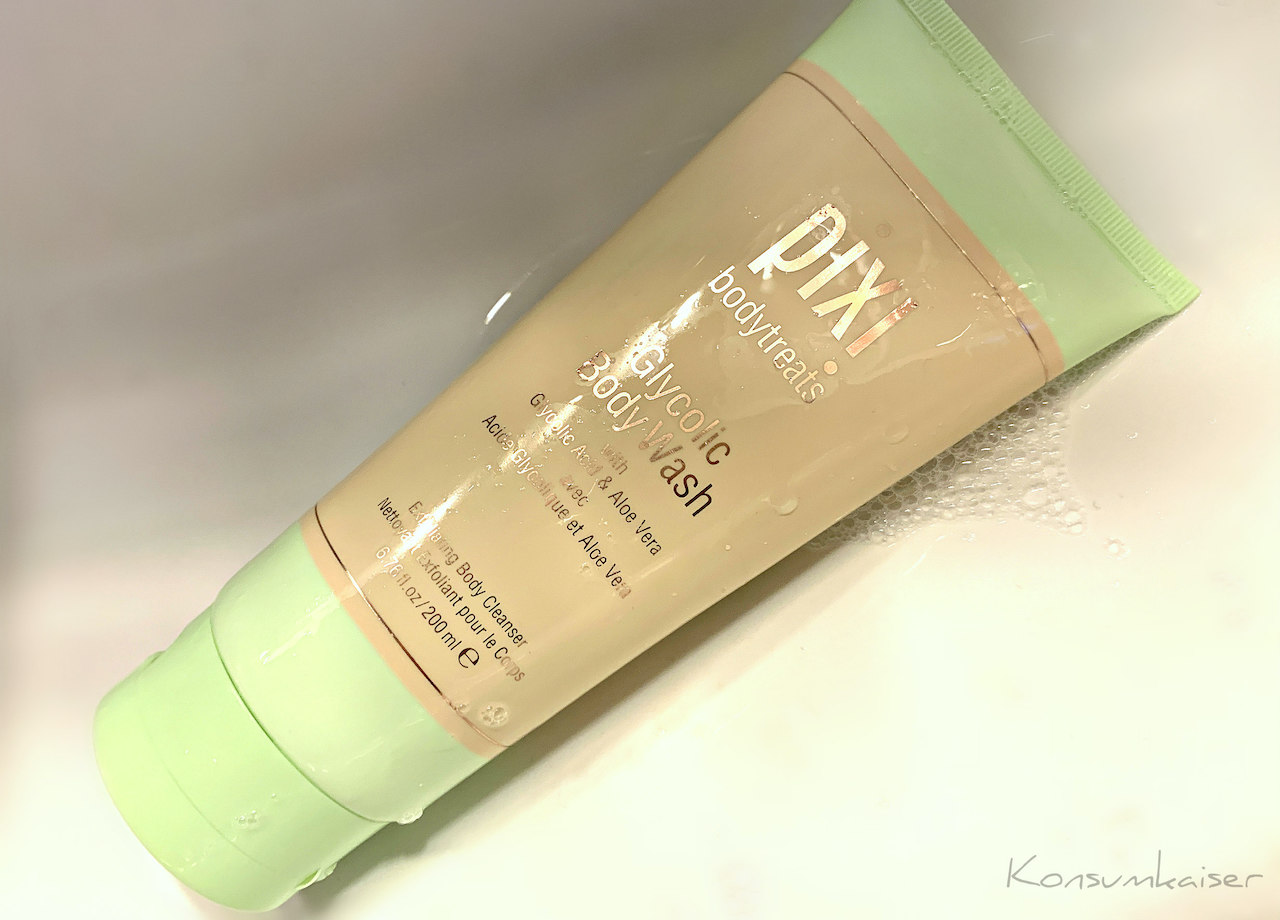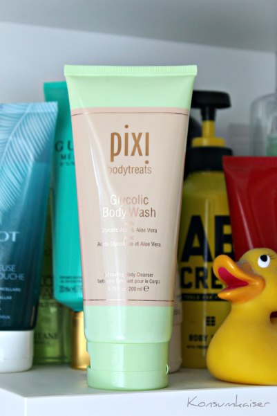 Da ich ja letztens schon über das Pixi Dusch-Schrubbelpeeling mit Bimsstein berichtet habe (HIER), wollte ich nun auch einen Blick auf das Duschgel mit Glykolsäure werfen. Passte gerade ganz gut, denn ich fand ganz unvermittelt ein paar blöde Pickelchen auf dem Rücken. Und glaubt man diesem Internet, wirkt das Pixi-Zeugs auch dagegen wie Hölle. 😉