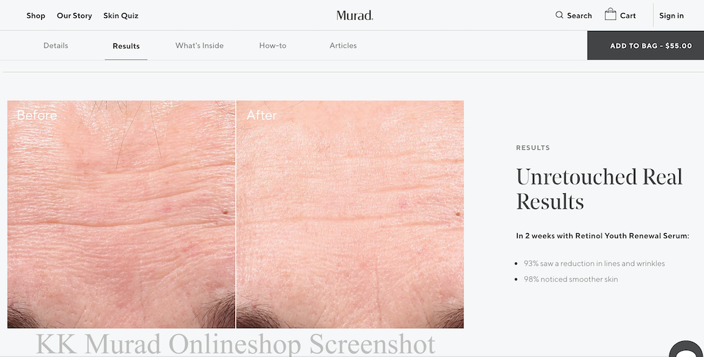 Sonderlich vertrauenserweckend wirken auch die typischen Vorher-Nachher-Bilder nicht, die Murad im Onlineshop veröffentlichen. Eine derartige Wirkung auf Falten dem Wirkstoff Retinol nach ZWEI WOCHEN zuzuschreiben, ist in meinen Augen unseriös: