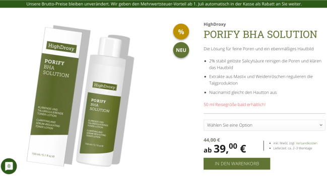 Die reguläre Flasche zu 150 ml ist in diesem Monat zum Einführungspreis zu bekommen. Daher beeile ich mich diesmal auch so mit meinem „First Look“. Anstatt 44,00 Euro kostet die Porify BHA Solution von HighDroxy also derzeit nur 39,00 Euro.