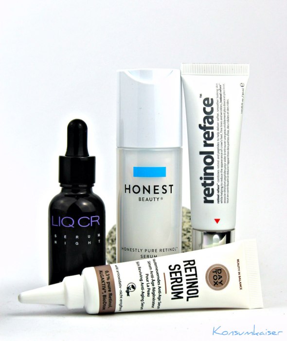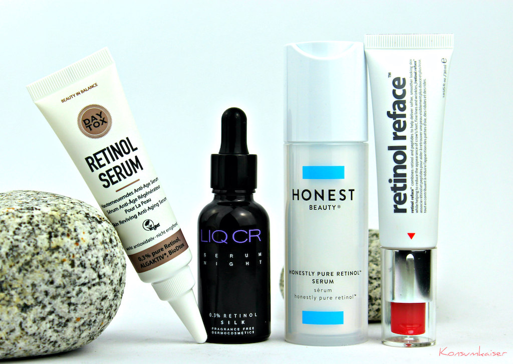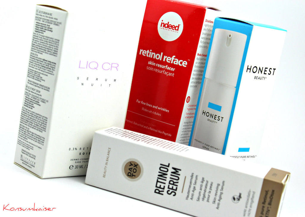 Heute eine kleine Übersicht über vier mittelstarke Retinolprodukte, die wahrscheinlich bisher nur wenige Leute auf dem Schirm haben. Sie kommen von der deutschen Marke „Day Tox“, der US Brand von Jessica Alba „Honest Beauty“, „Indeed Labs“ aus dem UK, und einer polnischen Indie-Marke namens „LIQ CR“.