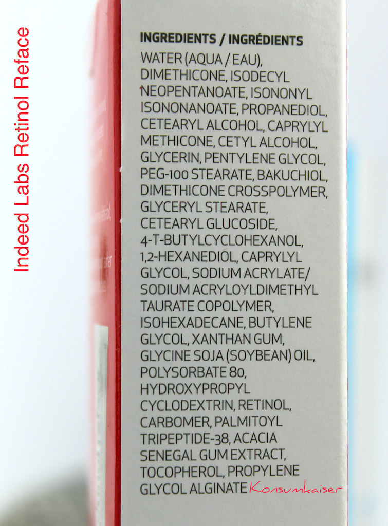 + Enthält („pures“) Retinol in einer Cyclodextrin-Matrix, die den Wirkstoff zeitverzögert an die Haut abgibt, und somit für eine bessere Verträglichkeit sorgt. Der Gehalt an Retinol wird nicht angegeben, ich schätze ihn aber definitiv unter 0,3%, da die Firma eine sehr breite Masse anspricht und dementsprechend keine Risiken eingehen wird. Das ist aber immer noch wirksam und einen versuch wert, man muss nur noch etwas mehr Geduld haben.